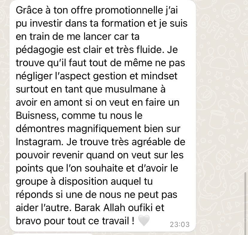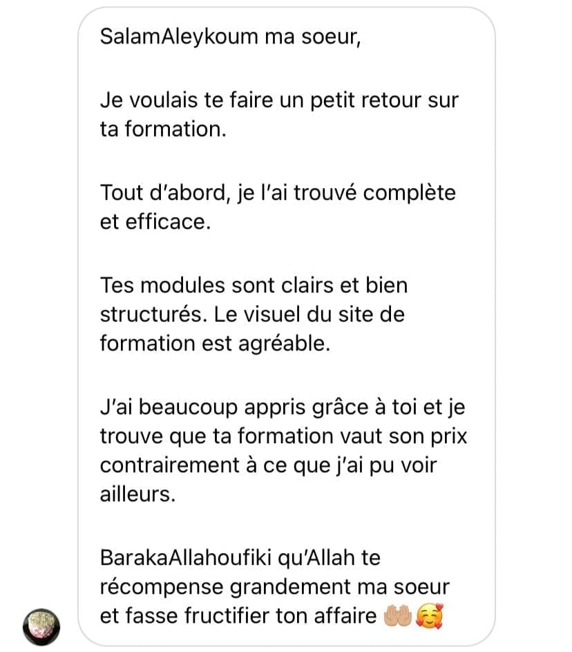“C’est exactement ce dont j’avais besoin pour arrêter de tourner en rond. Merci pour la clarté, la générosité du contenu et la motivation Soraya.”